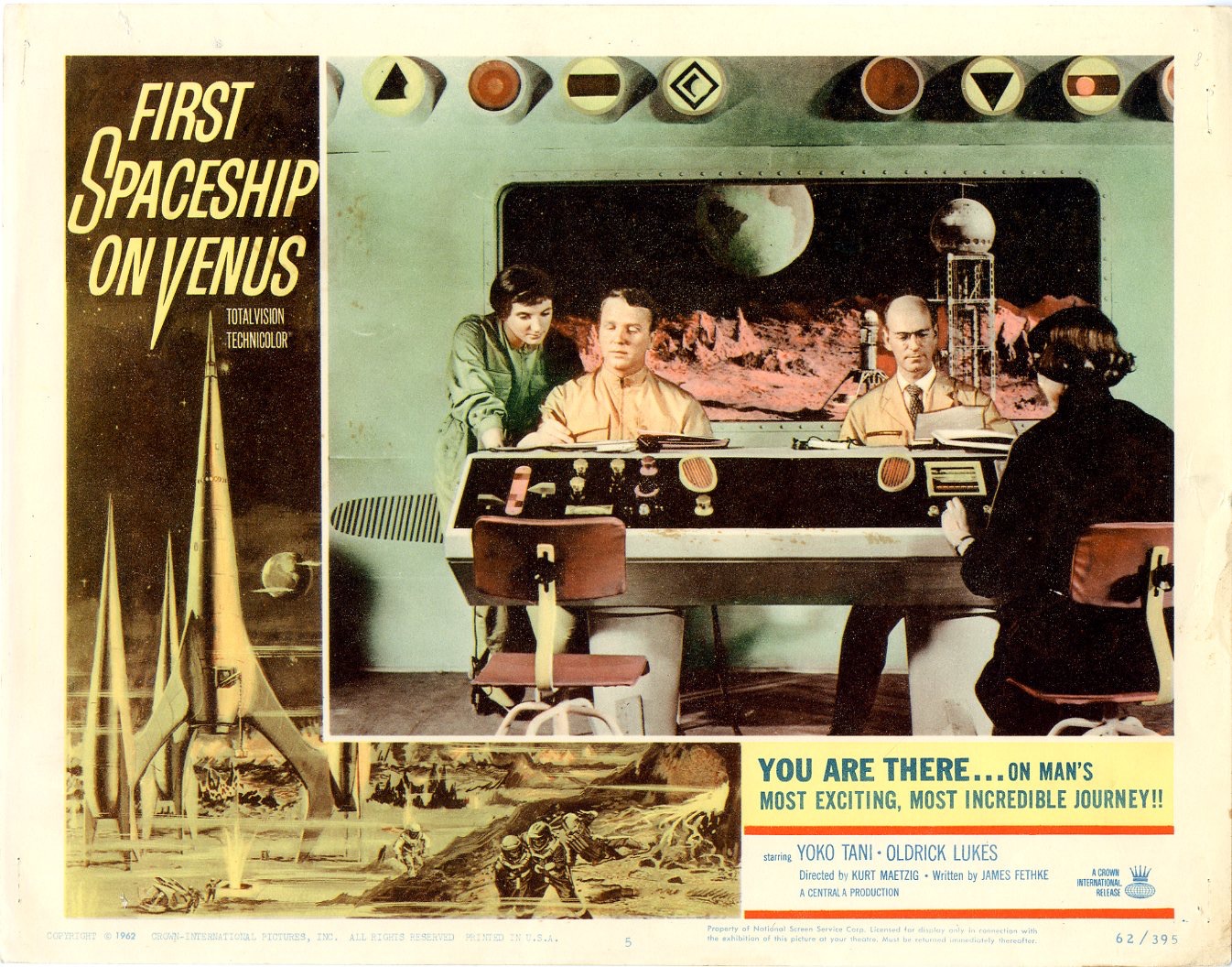 The international flavor of the cast is a nice touch, predating STAR TREK by several years. (The credits even list the cast according to nationality rather than name: e.g., “Kurt Rackelmann as the Indian Mathematician”). Nevertheless, there is a condescending pro-communist attitude: it’s clear that the Soviets have been to the moon first, and they graciously allow an American, Dr. Hawling (Oldrich Lukes) on board their rocket to Venus, even while occasionally guilt tripping him about his country’s use of the atomic bomb against Japan. And the fact that one of the sacrificial lambs is the ship’s sole African astronaut [Julius Ongewe] plays like a bad joke: we may all be brothers in THE SILENT STAR’’s Iron Curtain ideology , but the “brother” is left behind. At least “The Chinese Linguist” (Tang Hua-Ta) – who is a biologist on the side! – learns that his experiments have uncovered life on Venus, before he meets his fate.